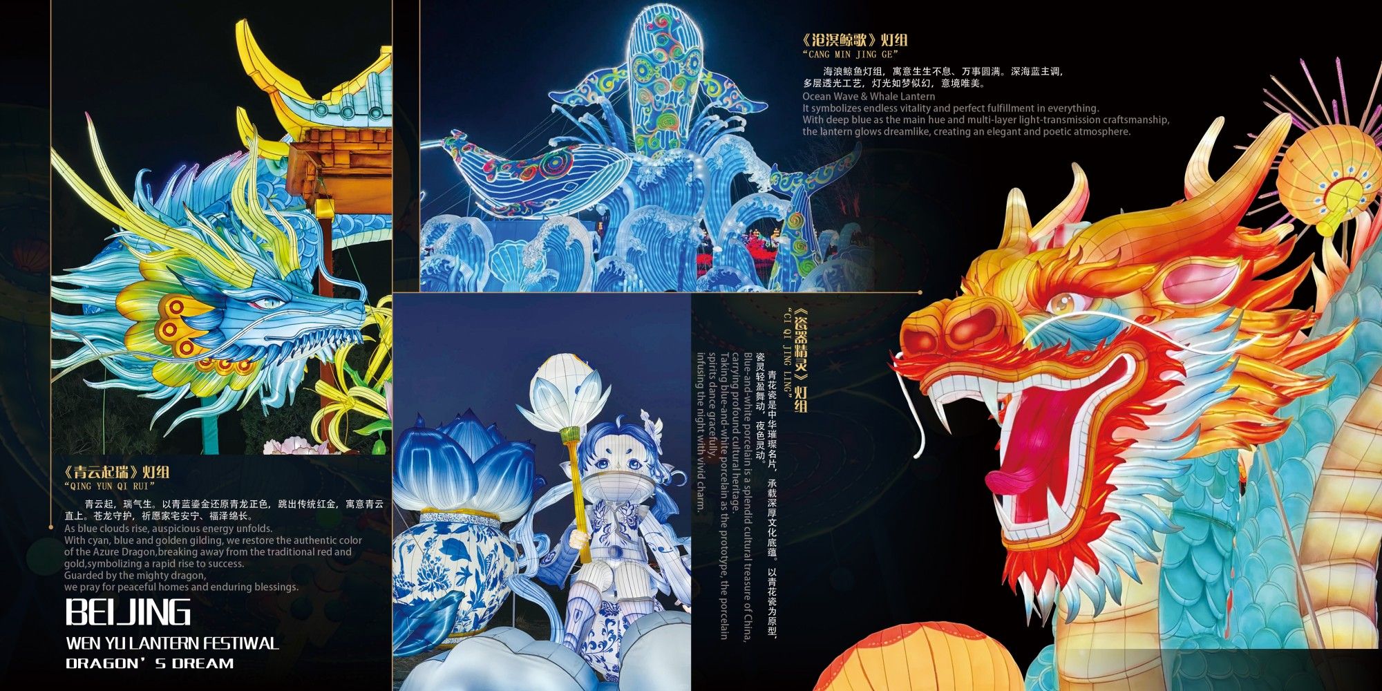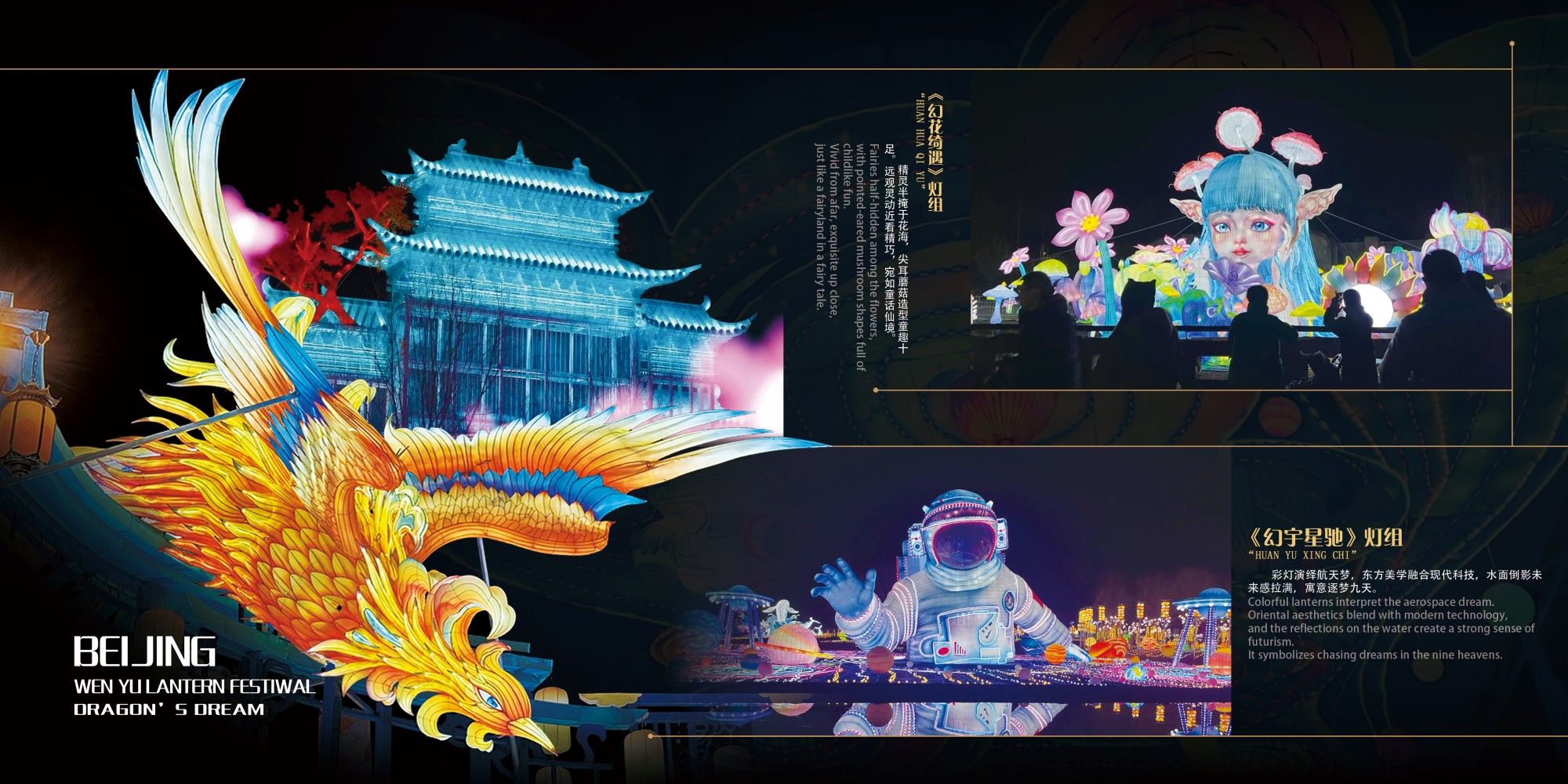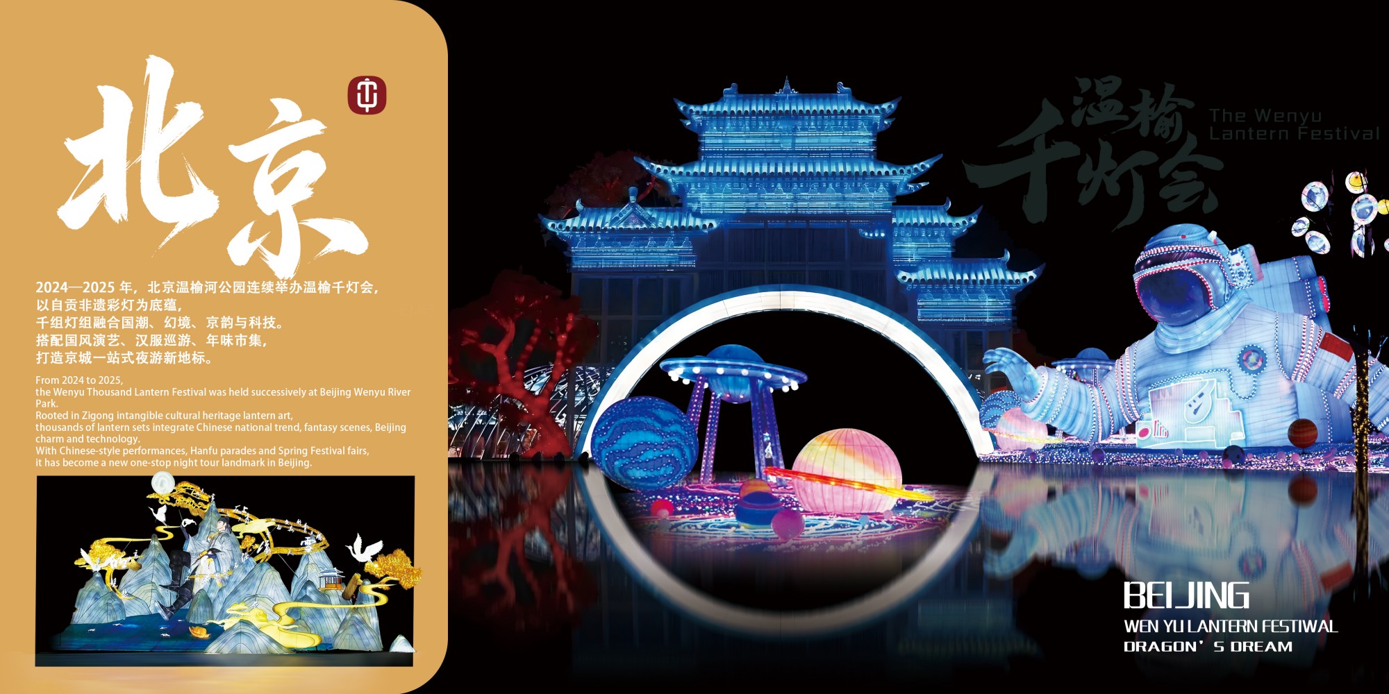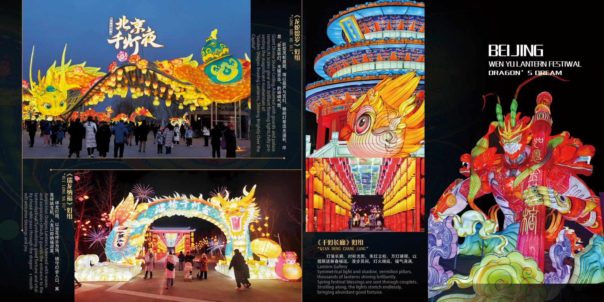 北京温榆河公园携手自贡彩灯在温榆河公园一期举办“首届温榆千灯会”。本次灯会拥有400亩超大空间,为北京最大灯会。千灯会主打中国传统文化元素,设置“新春祈福”“祥龙贺岁”“温榆神话”“魔幻时空”“浩渺星际”“奇艺丛林”六大主题区域,一共展出超千组彩灯,每一盏彩灯都经过多道工序打磨,通过“形、色、声、光”,将灯会的传统年味、国潮文化、未来科技完美融合。