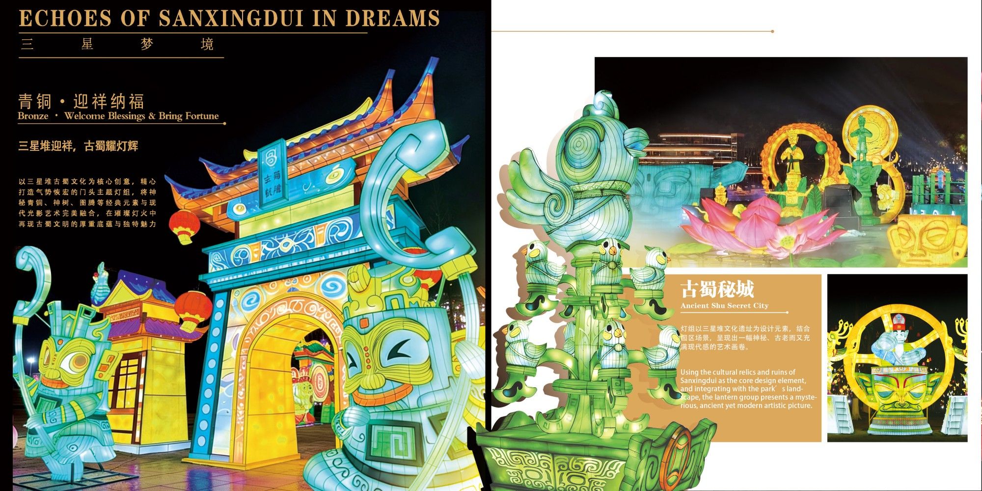 “三星璀璨,灵蛇献瑞”,第十六届德阳灯会在玄珠湖公园盛大启幕。本届灯会,太阳文化创意有限公司原创设计48组大型主题灯组、五大板块主题。巧妙地将古蜀文化的神秘深邃与彩灯展现完美融合,多方面展示德阳文化、三星堆文化和喜庆祥瑞的蛇年新年元素。