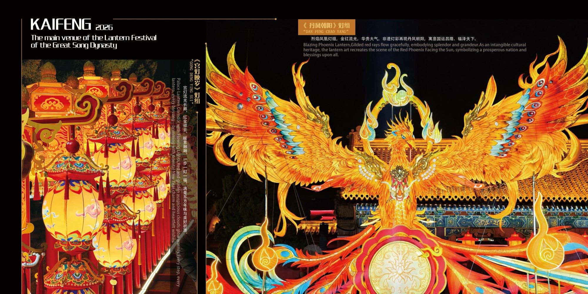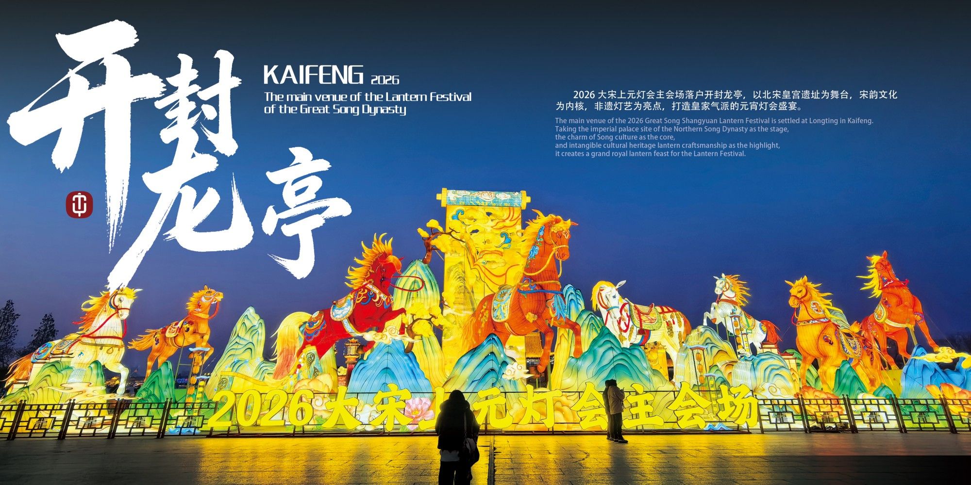 当辛弃疾笔下的“东风夜放花千树”在千年后的汴梁城头重现,古都开封用一城灯火,书写了2026年新春华章。自贡太阳文化有限公司负责“龙亭景区”主会场的设计与承建,以千年宫廷文化为脉络,九大主题灯组分布景区各处,气势宏伟。《八骏呈翔》《丹凤朝阳》《麒麟献瑞》等大型灯组数十组,将宋代宫廷美学与马年吉祥寓意完美融合。